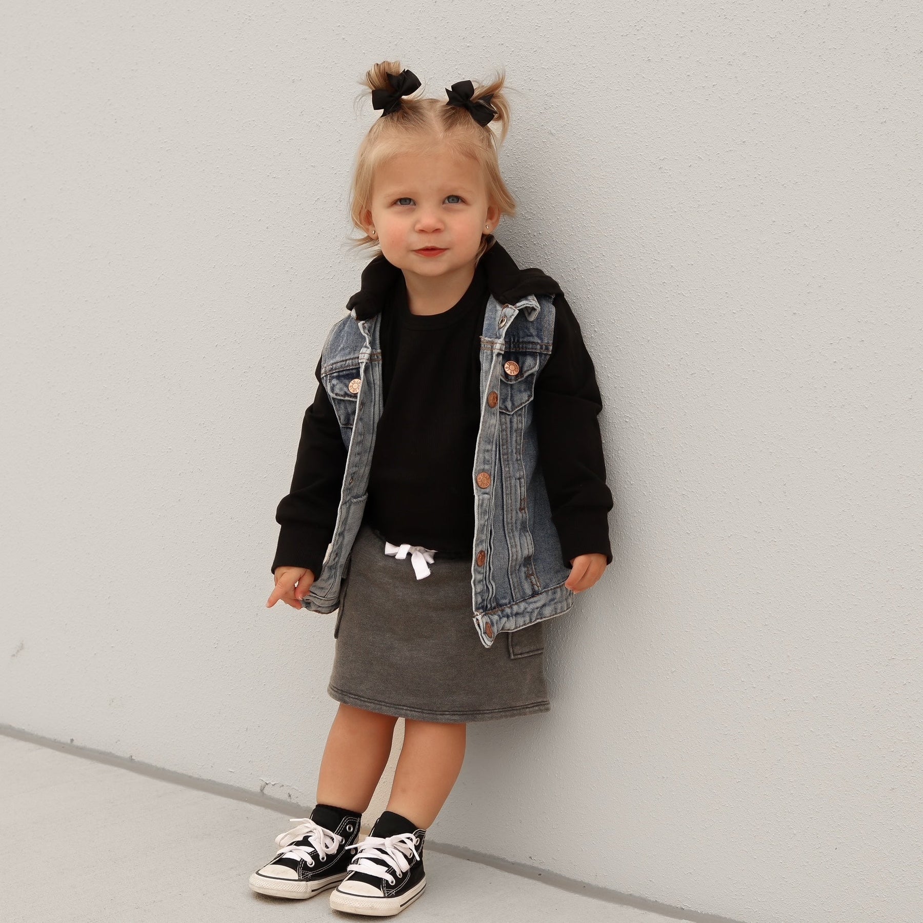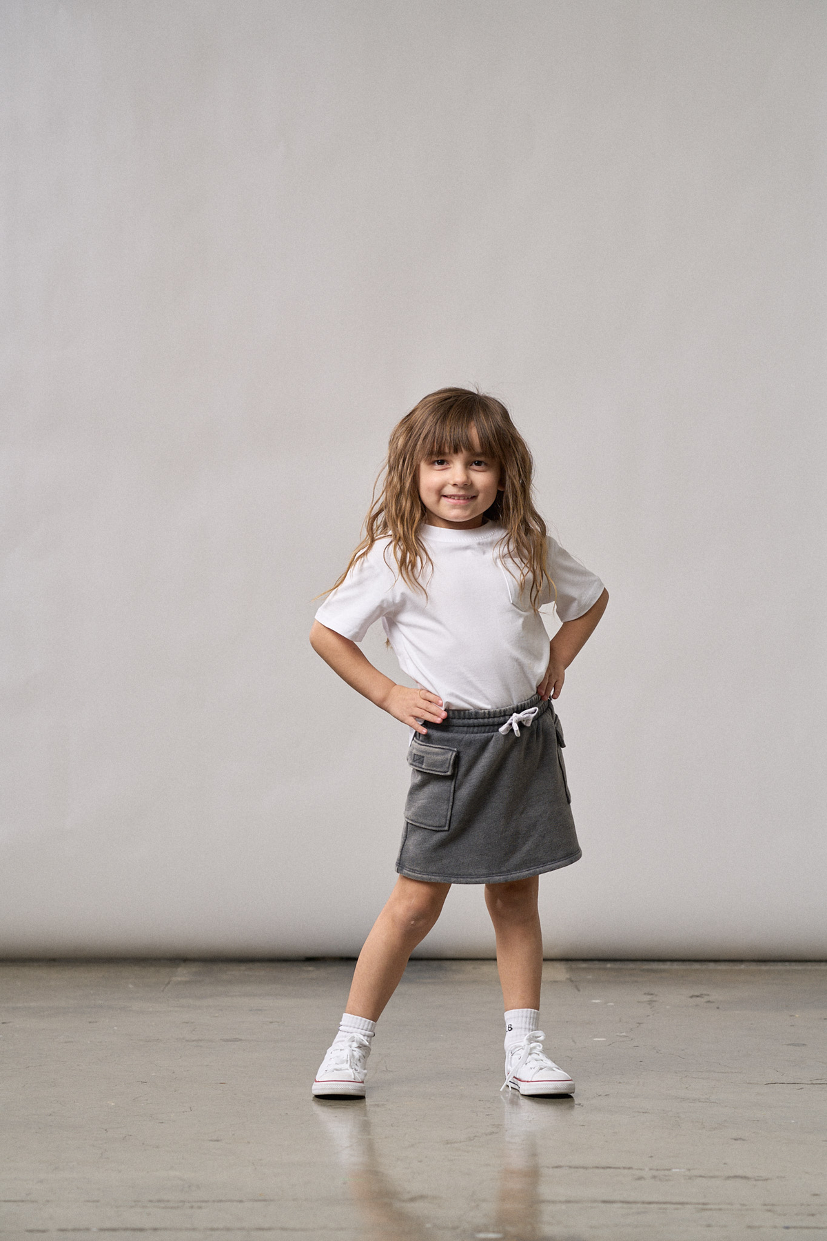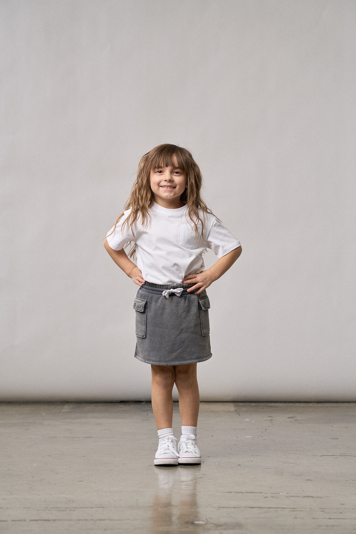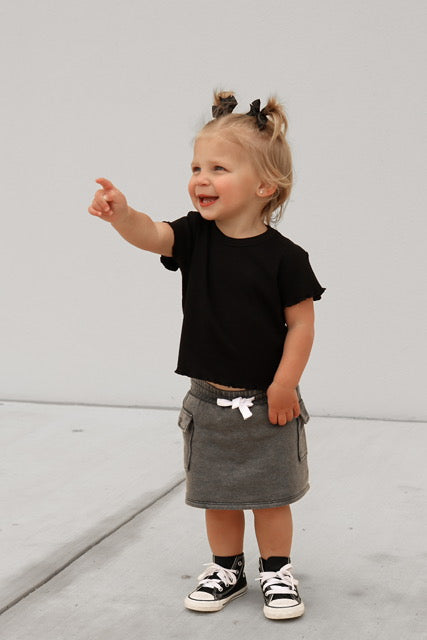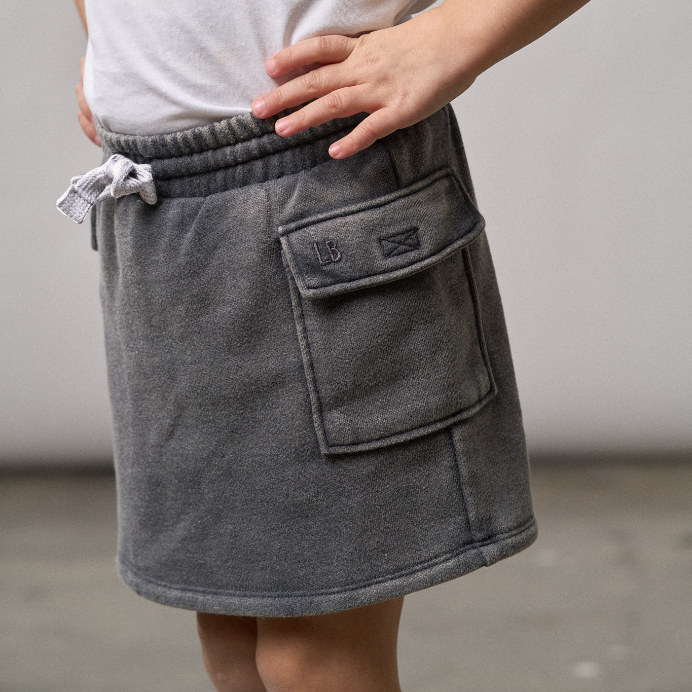 Adventure-ready and stylish, our Cargo Skort is the perfect blend of comfort and functionality. Made with a trendy charcoal wash, this skort features a ribbed elastic waistband for a secure, comfy fit, and a functional sewn-in drawstring for added adjustability. The Velcro cargo side pockets offer plenty of space for all the little essentials they need on the go.